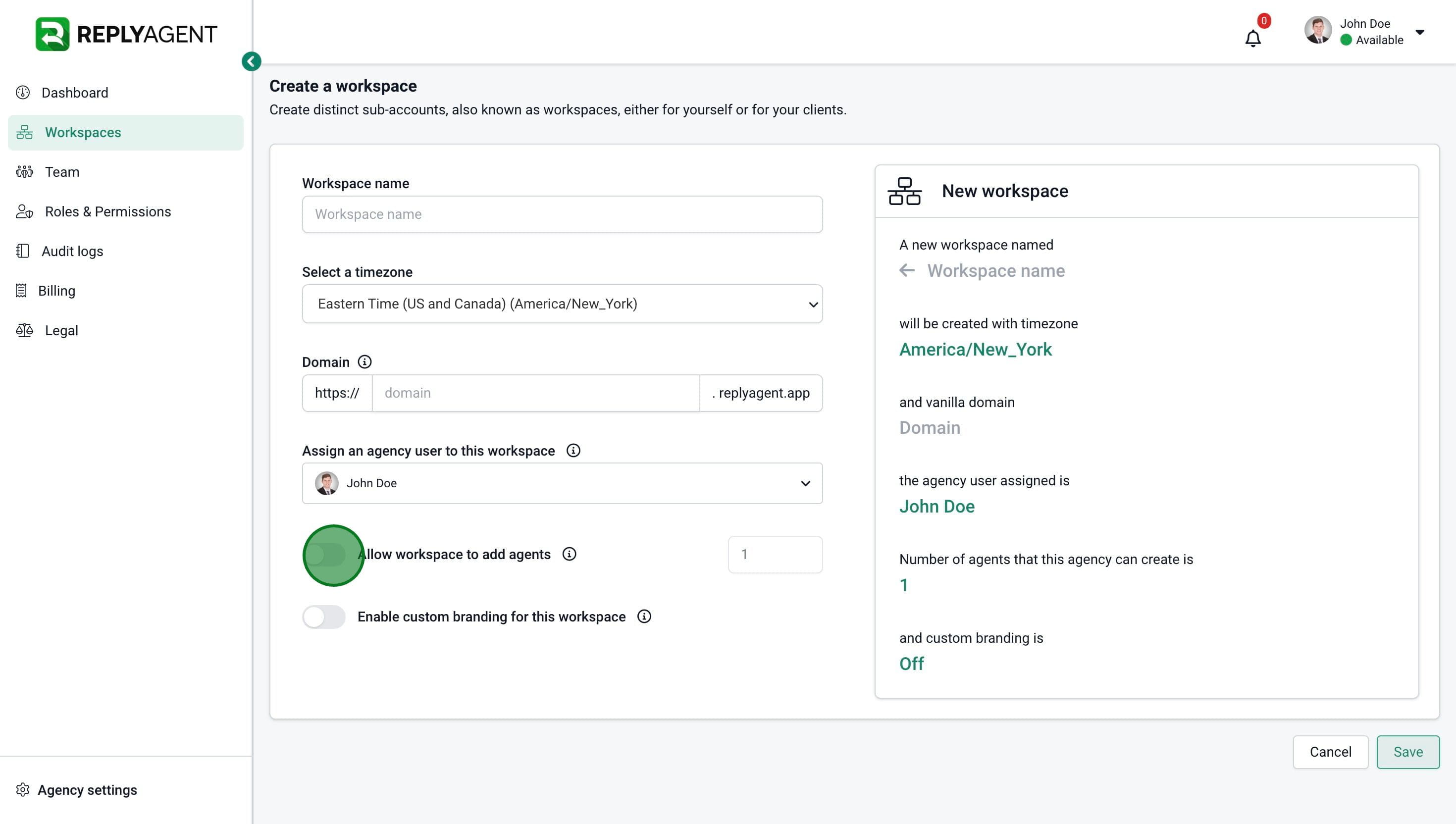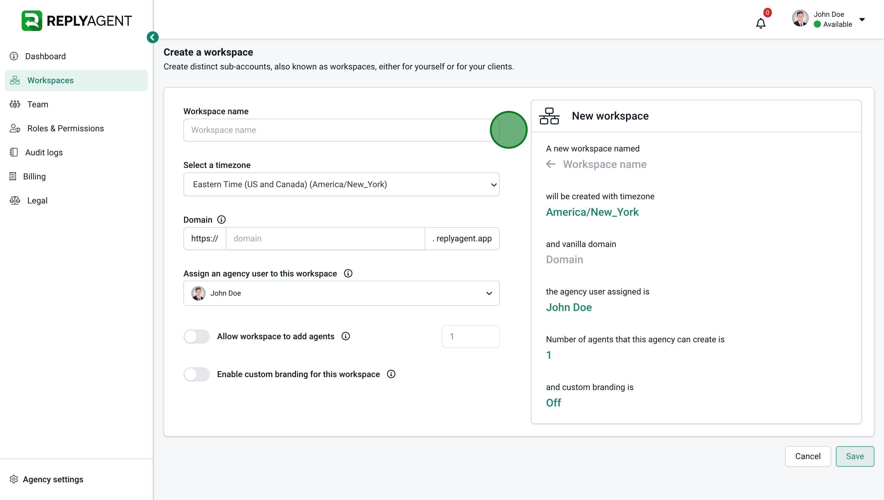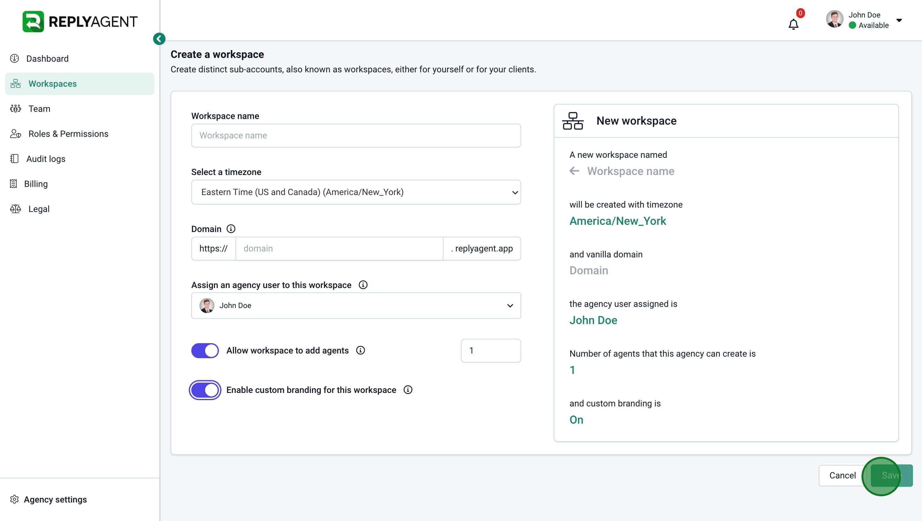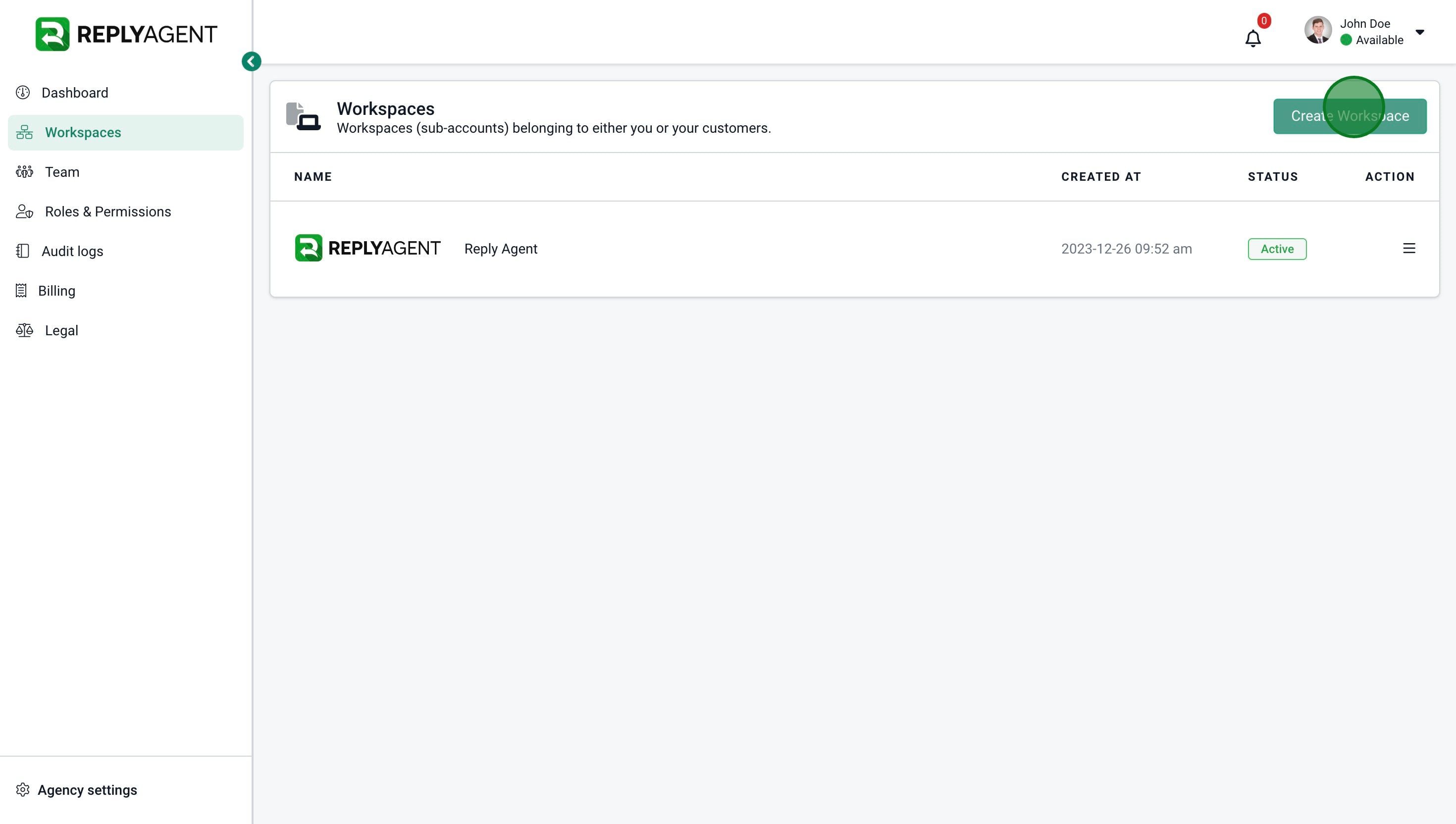 To create a Workspace, simply navigate to the Workspaces section within your Agency account and click on the 'Create' button.
