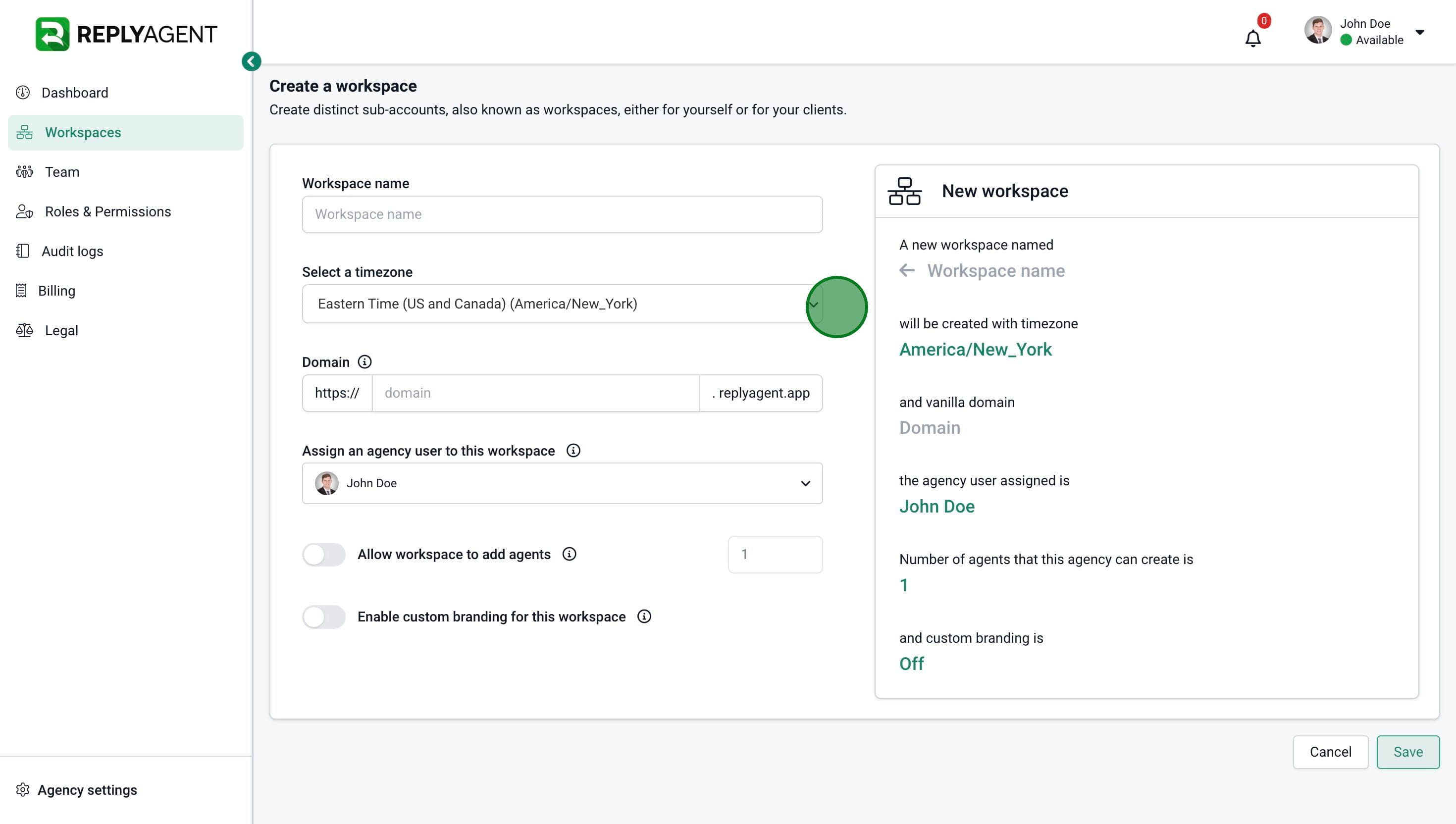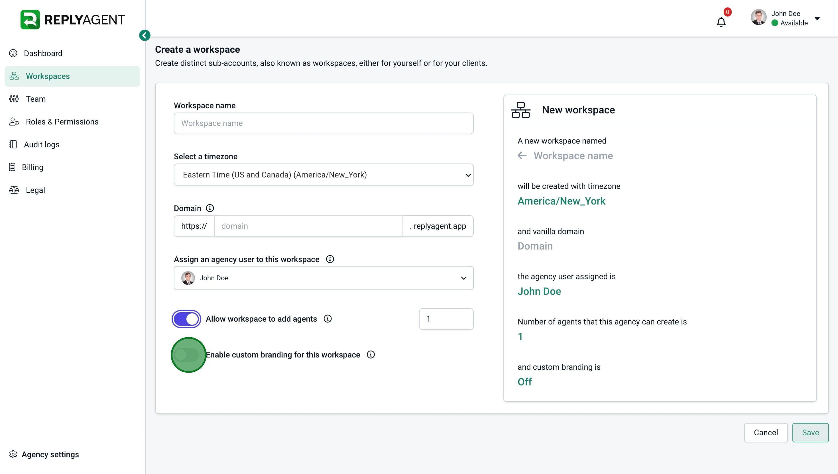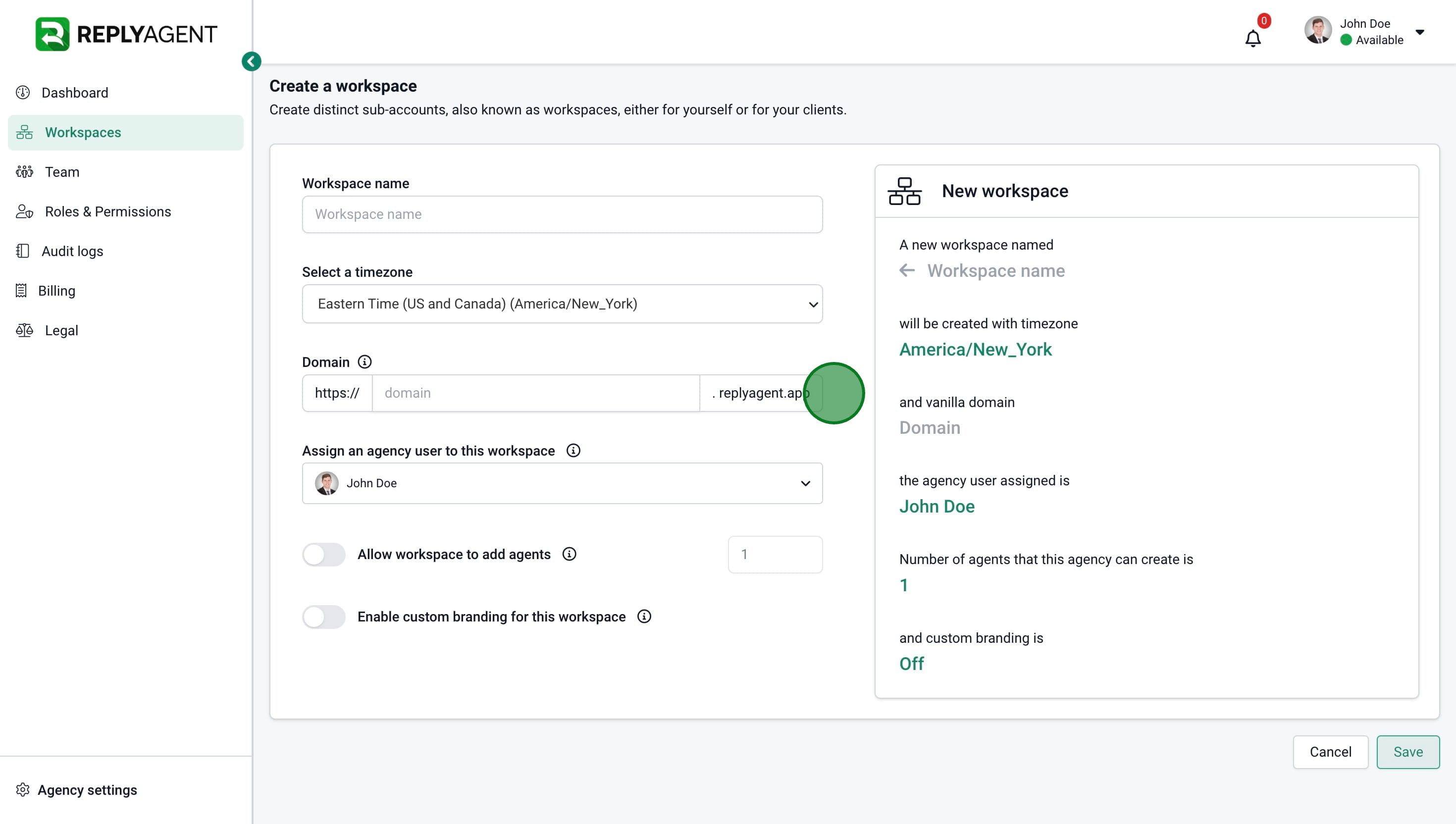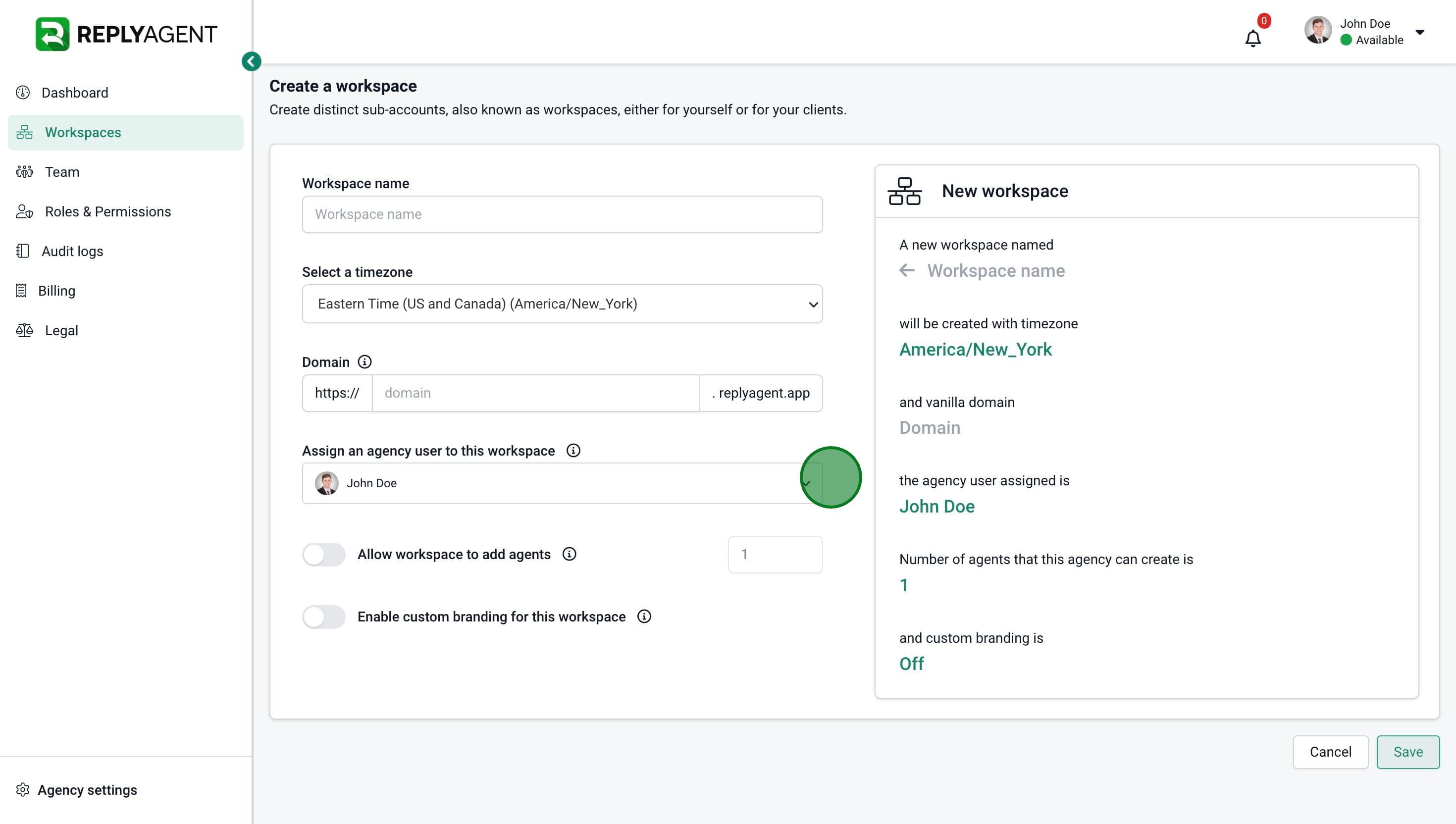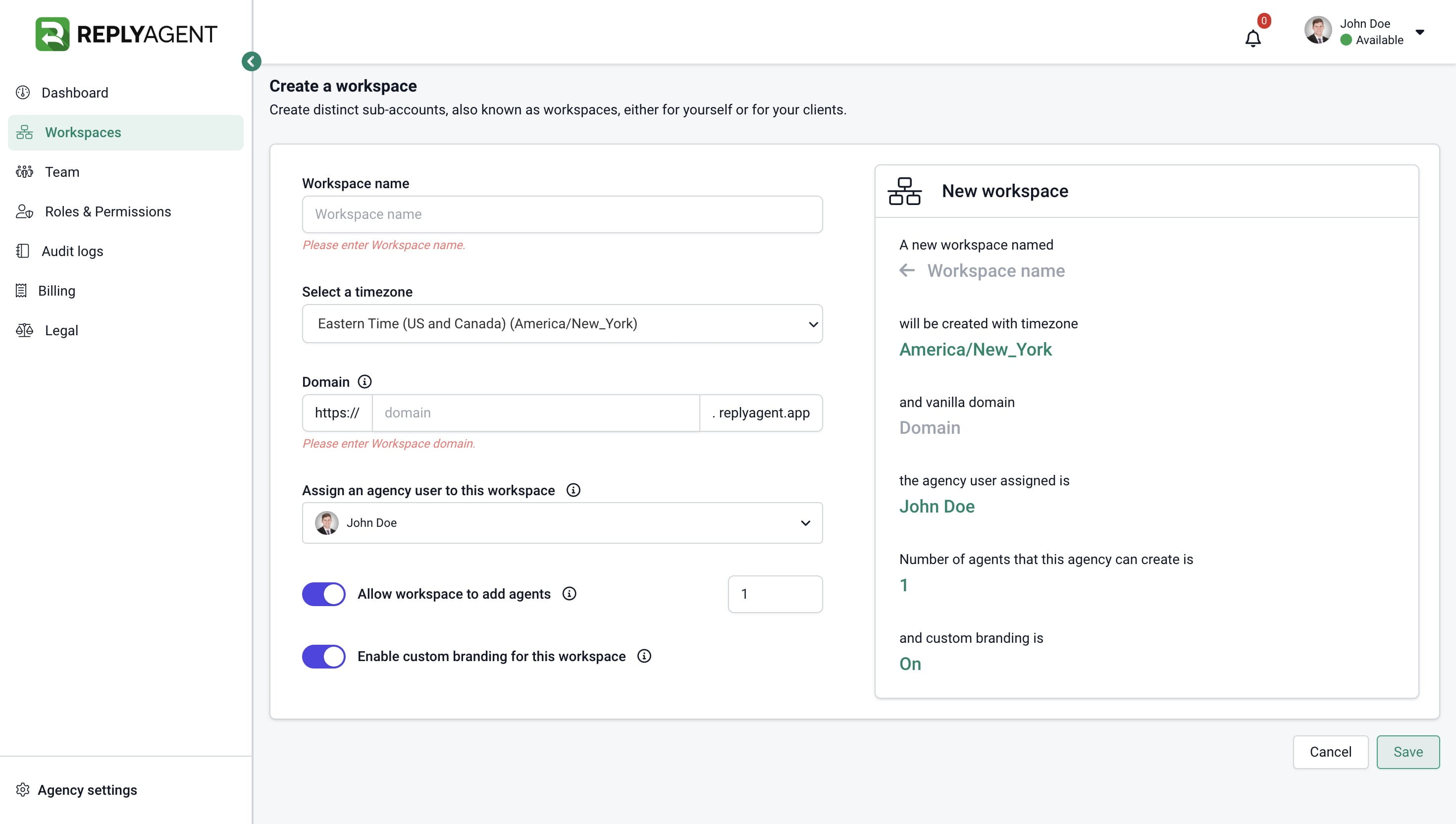 To create a Workspace, simply navigate to the Workspaces section within your Agency account and click on the 'Create' button.